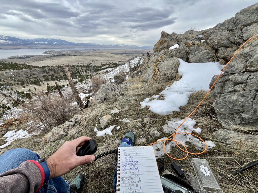 A quick Summit-To-Summit (S2S) with K7GUD in Arizona, and on to 20-meters SSB, and CW. I was pleasantly surprised to hear Christian, F4WBN, on both modes. It is always amazing to me to work DX from a summit. I’m sure Christian has a great station as I was only running 8W and an EFHW antenna. Then another S2S with Elliot (K6EL). The 2-meter support from local hams also helped including a great contact with Eric and Stacy (KE7NLU, KK7CJV) nearly sixty miles south in Bozeman.