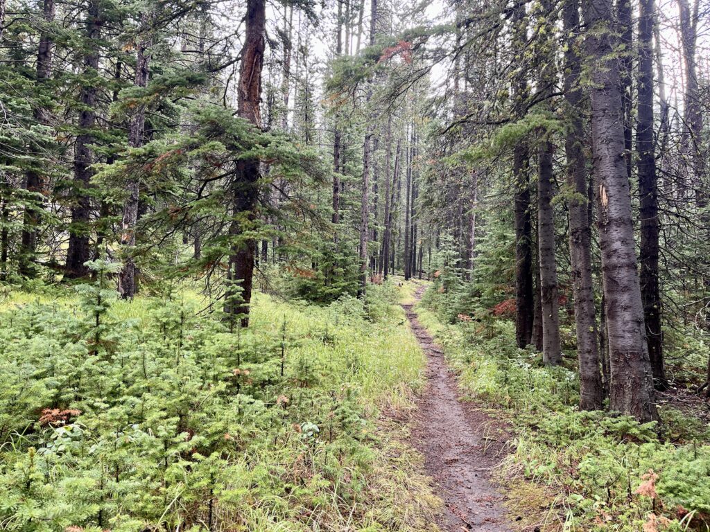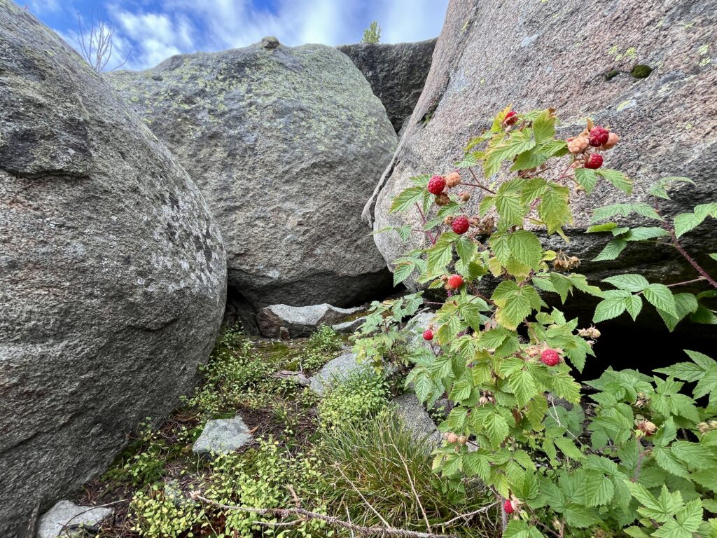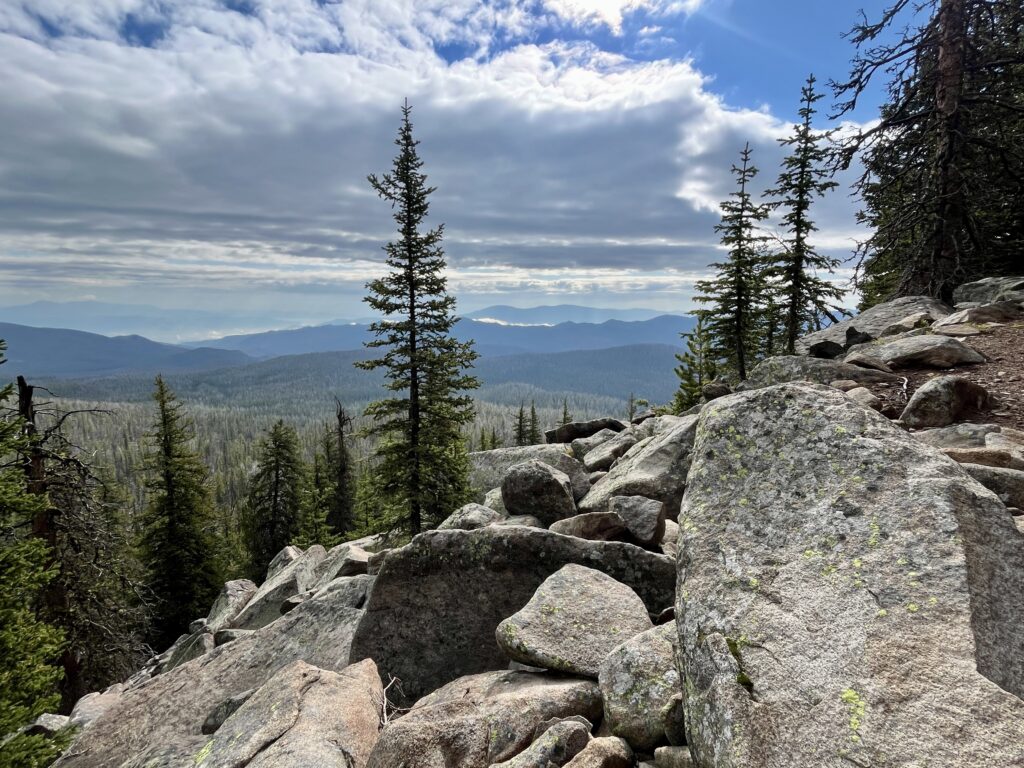The hike to the top is about 2.8 miles each way. From my perspective it was about as perfect of a trail as I could ask for. The forest floor was boulder strewn and mixed with a green carpet of whortleberries throughout the stands of lodgepole pines and some fir. There were some moderately steep sections but nothing too challenging. Along the way I passed several little brooks with crystal clear water. Occasionally I would walk though a patch of air that smelled wonderfully unique. After stopping to pick a few berries I realized it was a combination of the classic pine forest smell and a waft of whortleberry aroma. I wish I could have bottled up that smell to save for later.